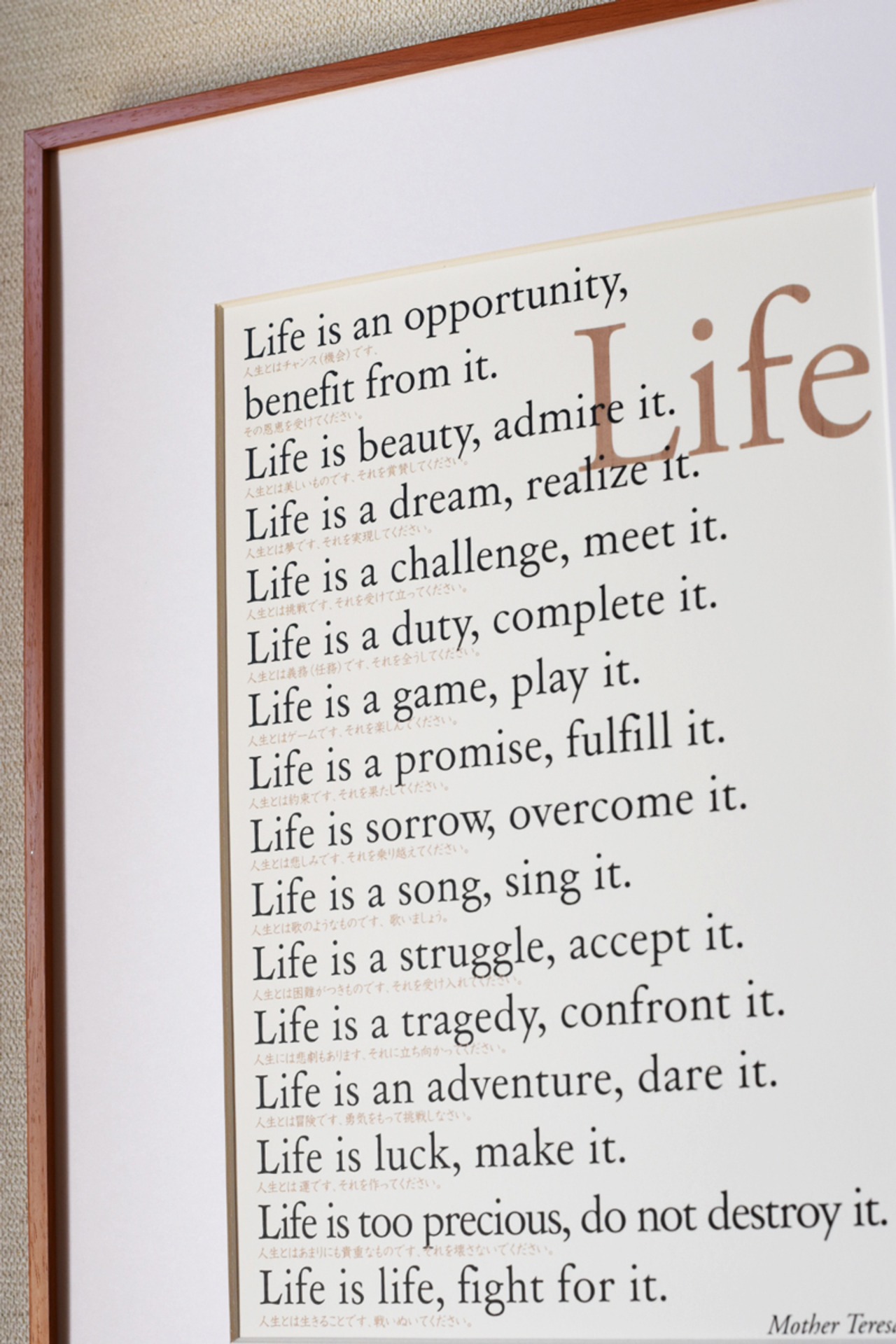 マザーテレサの深い名言「Life」のポスターです♪