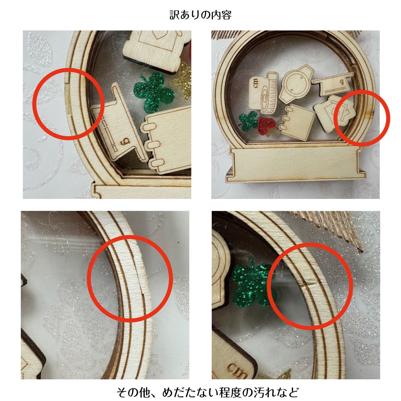 (木材の一部欠け、汚れ、傷、プリントのずれなど)